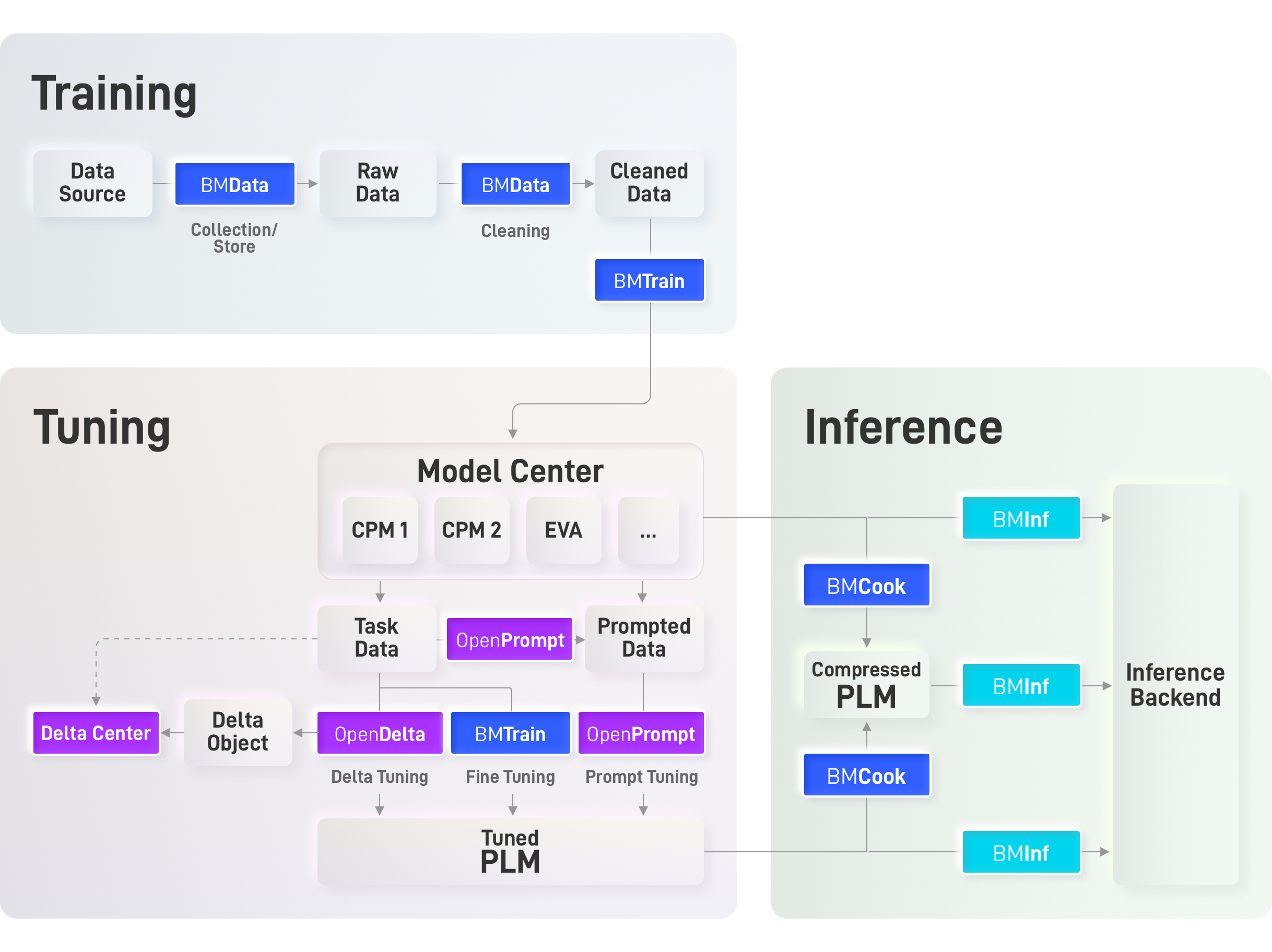 针对上述难题,我们推出了大模型高效训练工具包BMTrain与模型仓库ModelCenter。