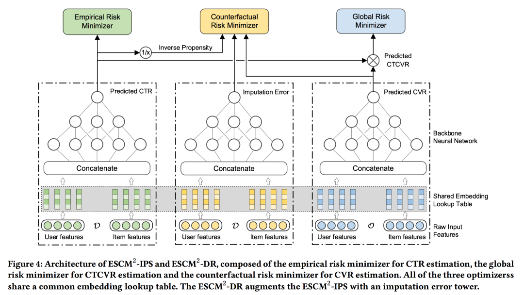 ESCM^2在ESMM基础上做了升级,提出了一种新的CVR预估模型,即:全空间反事实多任务模型,借助因果推断来解决ESMM中存在的预估有偏和独立性先验这两大问题。其中,预估有偏(IEB,Inherent Estimation Bias)是指ESMM预估的CVR天然比ground truth的CVR要大;独立性先验(PIP,Potential Independence Priority)是指ESMM在建模CTCVR时,会忽视"转化"依赖于"点击"这一因果关系。因此提出了,利用因果推断中的反事实经验最小化作为正则项来同时解决IEB和PIP问题。在/离线实验表明模型不仅能解决这两大类问题,指标上也显著优于其他基线模型。