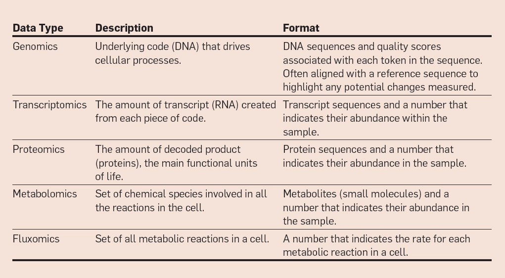 这种情况通常会造成稀疏的数据集合,稀疏的数据集合只表示构成组学数据栈的多个层的一小部分。在这种情况下,数据表示对集成这些孤立数据集进行综合建模的能力有重大影响。目前,业界在各个垂直领域都投入了大量工作,执行数据清理、模式对齐以及提取、转换和加载操作(ETL),用这种方式收集难以控制的数字数据,并将其准备为适合分析的形式。这些任务占据了数据科学家近50%到80%的时间,限制了他们深入探索的能力。处理大量的数据类型(数据多模态)是合成生物学研究人员面临的一个挑战,与数据量相比,预处理活动的复杂性随着数据多样性的增加而急剧增加。