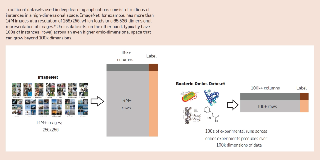 建模/算法的挑战。许多推动当前人工智能进步的流行算法(例如计算机视觉和NLP领域的流行算法)在分析组学数据时都没有鲁棒性。当应用于特定实验中收集的数据时,这些模型的传统应用常常遭受“维数灾难”的困扰。在特定条件下,一个实验人员可以就一个生物体产生超过12,000个测量值(维度)的基因组学、转录组学和蛋白质组学数据。对于这样一个实验,标记实例的数量(例如,成功或失败)通常最多只有几十到几百个。对于这些高维数据类型,很少捕捉到系统的动态(时间分辨率)。这些测量误差使得对复杂的动态系统进行推断成为一个重大挑战。