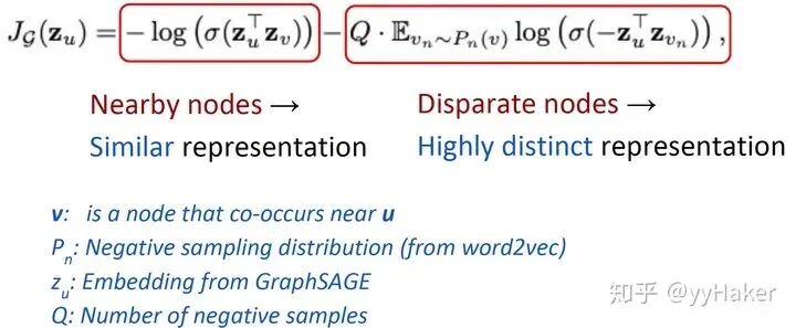 到此为止,整个模型的架构就讲完了,那么GraphSAGE是如何学习聚合器的参数以及权重矩阵 呢?如果是有监督的情况下,可以使用每个节点的预测lable和真实lable的交叉熵作为损失函数。如果是在无监督的情况下,可以假设相邻的节点的embedding表示尽可能相近,因此可以设计出如下的损失函数,