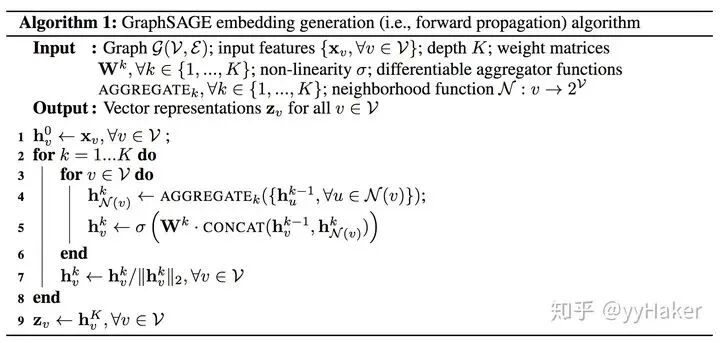首先,(line1)算法首先初始化输入的图中所有节点的特征向量,(line3)对于每个节点 ,拿到它采样后的邻居节点 后,(line4)利用聚合函数聚合邻居节点的信息,(line5)并结合自身embedding通过一个非线性变换更新自身的embedding表示。
