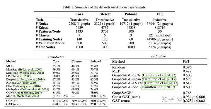 那么GAT的具体效果如何呢?作者分别在三个Transductive Learning和一个Inductive Learning任务上进行实验,实验结果如下: