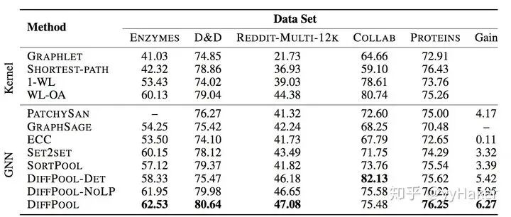 至此,DiffPool的基本思想就讲完了。那么效果如何呢?作者在多种图分类的基准数据集上进行实验,如蛋白质数据集(ENZYMES,PROTEINS,D&D),社交网络数据集(REDDIT-MULTI-12K),科研合作数据集(COLLAB),实验结果如下: