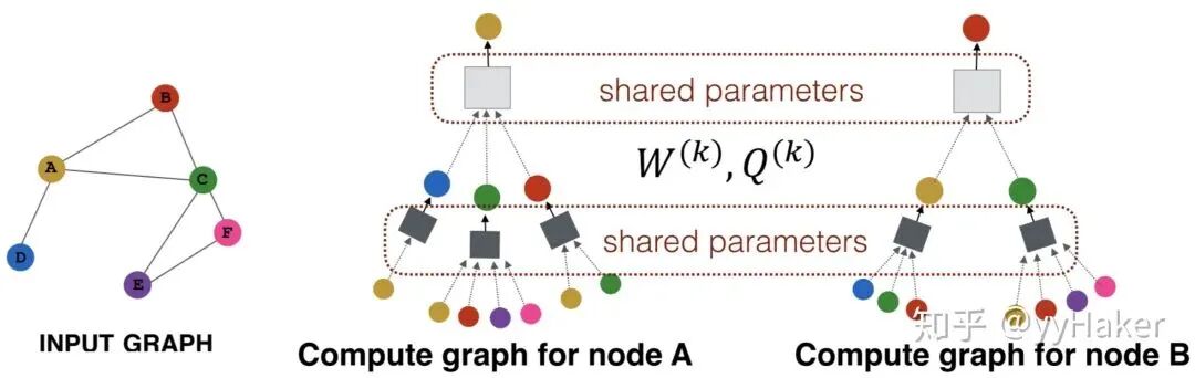 (2)聚合器和权重矩阵的参数对于所有的节点是共享的