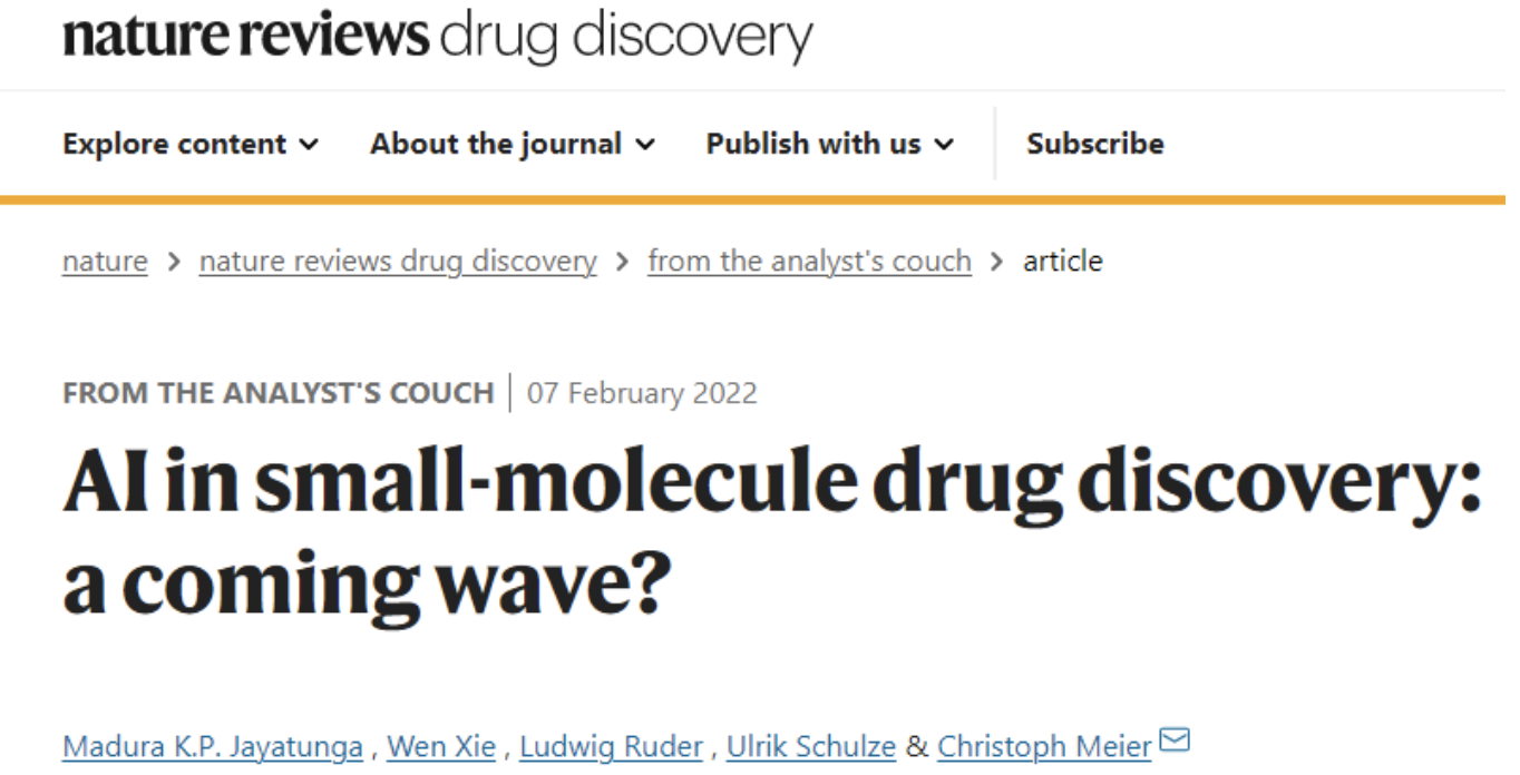今天带来的是波士顿咨询集团的Christoph Meier等人在《Nature Reviews | Drug Discovery》上发表的文章《AI in small-molecule drug discovery: a coming wave?》。