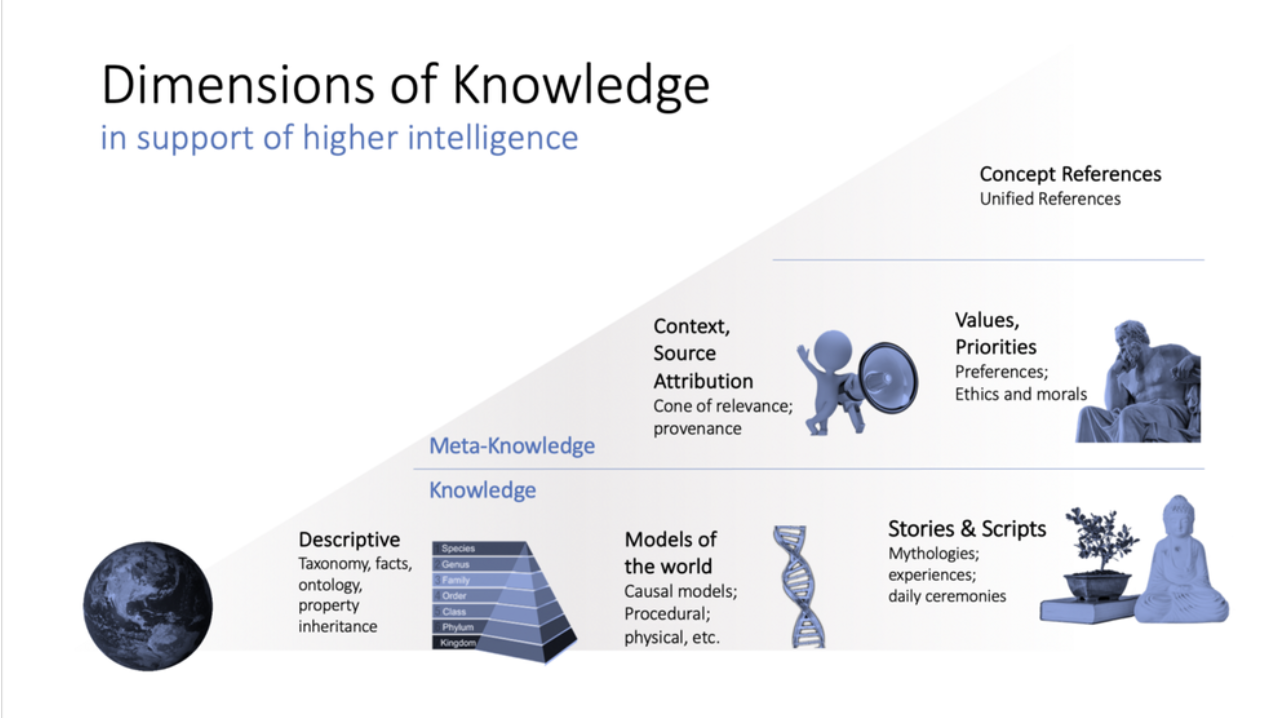 此外,故事提升了人类在共同信仰和神话基础上的理解和交流复杂故事的能力。语境和来源归因以及价值和优先级是元知识维度,这些维度带来了基于条件的有效性和知识的不断叠加。最后,概念参考是结构基础,跨维度、模态和参考而存在。