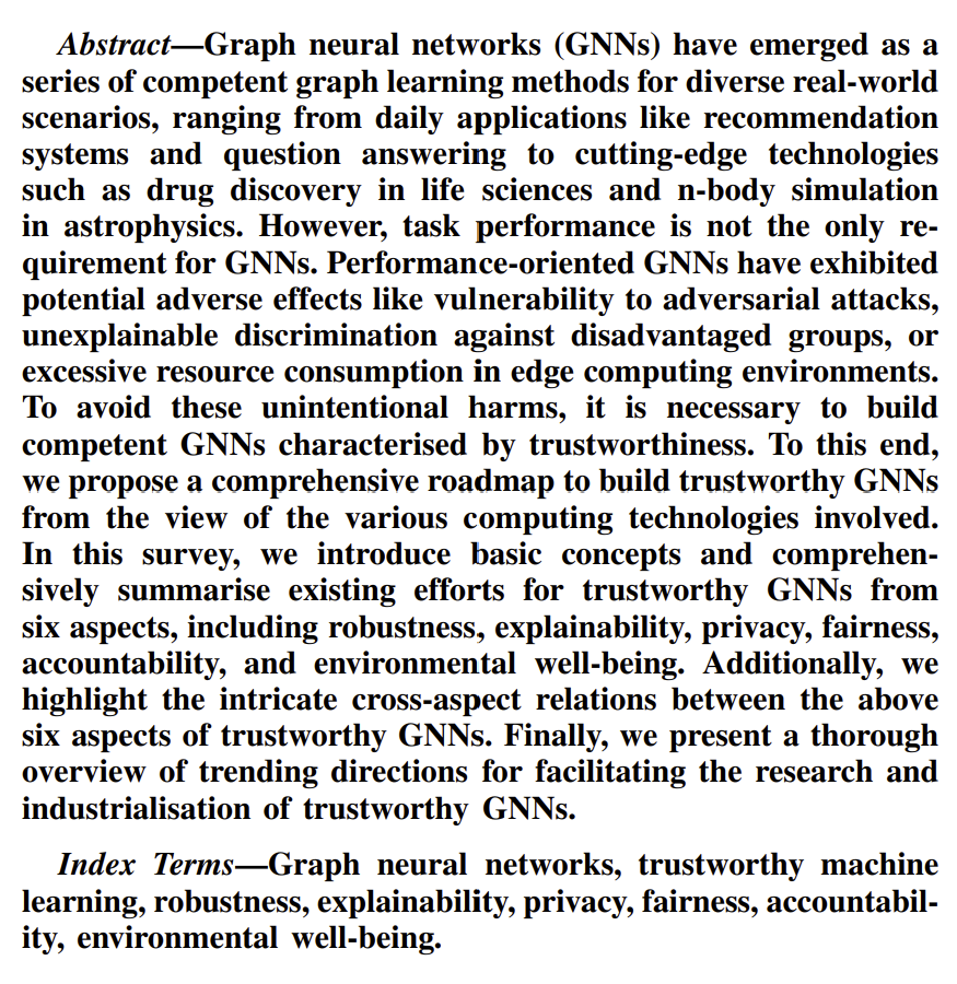 基于上述需求,人们愈发渴望基于图神经网络系统是可信的。在这样的背景下,这篇综述旨在总结“可信图神经网络(Trustworthy GNNs)”的最新进展,为相关研究人员和从业人员提供技术路线图,并为可信图神经网络的未来研究与产业化发展提供方向。