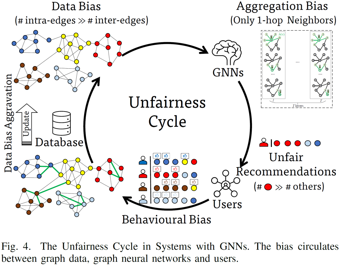 通过保护弱势群体或者个人的关键利益,公平的系统可以赢得人们的信任。公平的图神经网络系统意味着其预测结果中排除了对于某些群体或者个人的偏见。当前,图神经网络主要以数据驱动的方式来完成图计算任务。然而,图神经网络中的消息传播机制可能会进一步放大已经存在于数据中的偏见。此后,由于个人喜好或者行为偏差等因素,人们在与图神经网络服务交互的过程中将进一步加深图数据中的偏见。