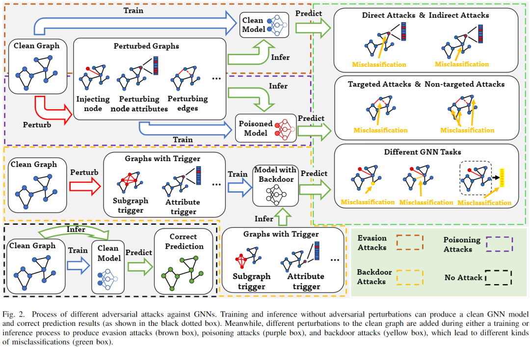 该综述总结了目前图神经网络鲁棒性研究的相关工作,并分别介绍了对抗攻击、防御的分类和一些典型方法。其中,对抗攻击的分类源自对攻击威胁模型(threat model)的分析,如下图所示;对防御的分类则更多基于该技术的具体执行阶段(target phase)。