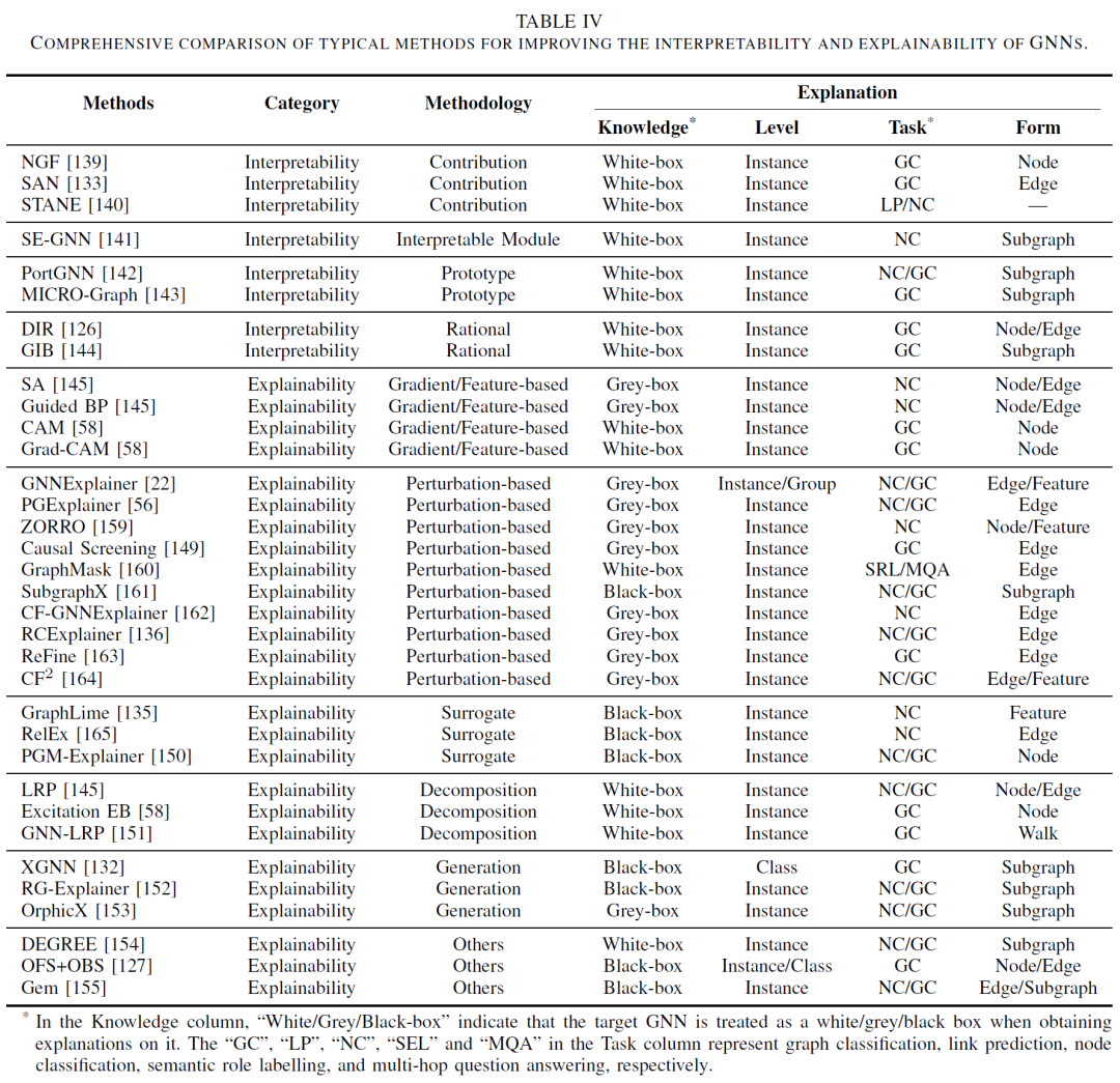在介绍了解释形式、解释方法的类别等基本概念后,该综述将涉及图神经网络可解释性的工作分成了自解释(interpretable GNNs)和事后解释(post-hoc explainers)两类。自解释(Interpretable GNNs)主要包含了贡献估计(contribution estimation)、引入可解释模块( introduction of interpretable module)、嵌入空间原型学习(embedding prototype learning) 和依据生成方法(rationale generation methods)。事后解释(post-hoc explainers)主要包含了基于梯度/特征的方法(gradient/feature-based methods)、基于扰动的方法(perturbation-based methods)、代理模型方法(surrogate methods)、分解方法(decomposition methods)、生成方法(generation methods)和其他方法(other methods)。