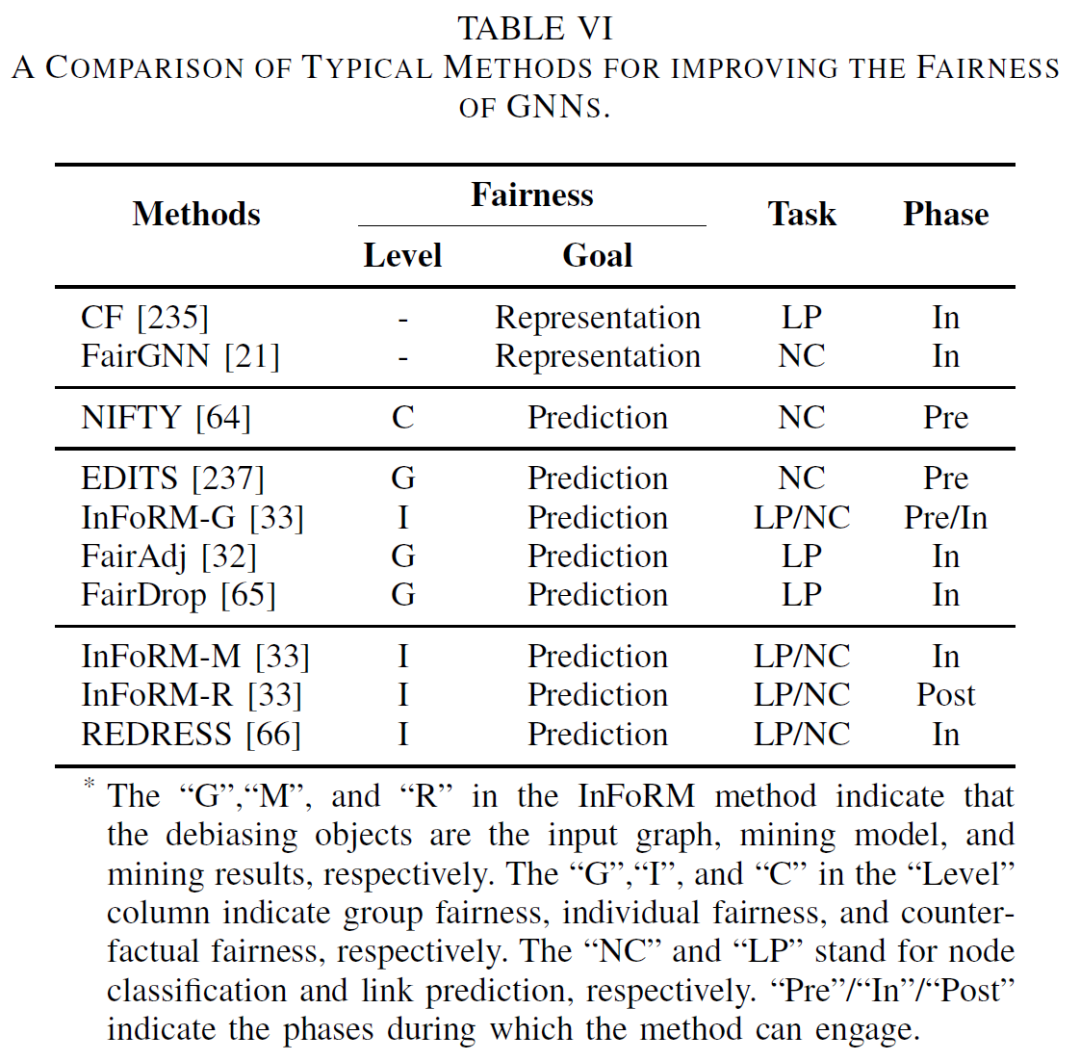 在介绍了公平性定义(group fairness,individual fairness, counterfactual fairness)、使用阶段(pre-processing, in-processing, post-processing)等基本概念后,该综述将当前的用于图神经网络公平性研究的方法分成了公平表示学习方法(fair representation learning methods)和公平预测增强方法(fair prediction enhancement methods)。在介绍完这些方法的基本原理后,对这些方法进行了全面的比较,如下表所示。
