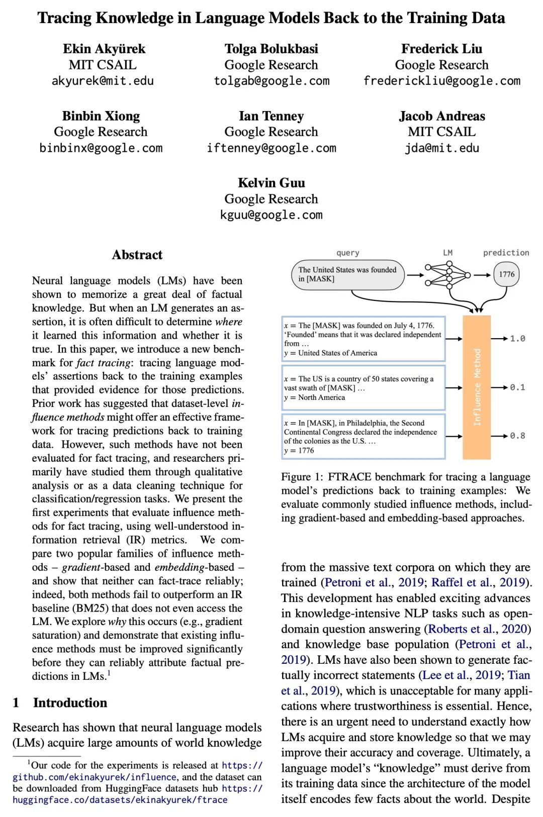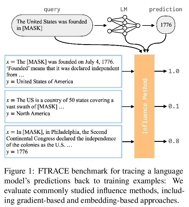 回到训练数据追溯语言模型中的知识。神经语言模型(LM)已经被证明可以记忆大量的事实性知识。但是,当神经语言模型产生一个断言时,往往很难确定它从哪里学到这些信息以及这些信息是否真实。本文提出一个事实追踪新基准:将语言模型的断言追溯到为这些预测提供证据的训练样本。之前的工作表明,数据集级影响方法可能提供了一个有效的框架,用于将预测追溯到训练数据。然而,这种方法还没有被用作事实追踪评估,研究人员主要通过定性分析或作为分类/回归任务的数据清理技术来研究它们。本文提出第一个用公认的信息检索(IR)指标评估事实追踪影响方法的实验。比较了两个流行的影响方法系列——基于梯度的和基于嵌入的——并表明这两种方法都不能可靠地追踪事实;事实上,这两种方法的表现都没有超过甚至没有访问LM的IR基线(BM25)。本文探讨了为什么会出现这种情况(例如,梯度饱和),并证明现有的影响方法在可靠地归因于LM中的事实预测之前必须得到显著的改善。
