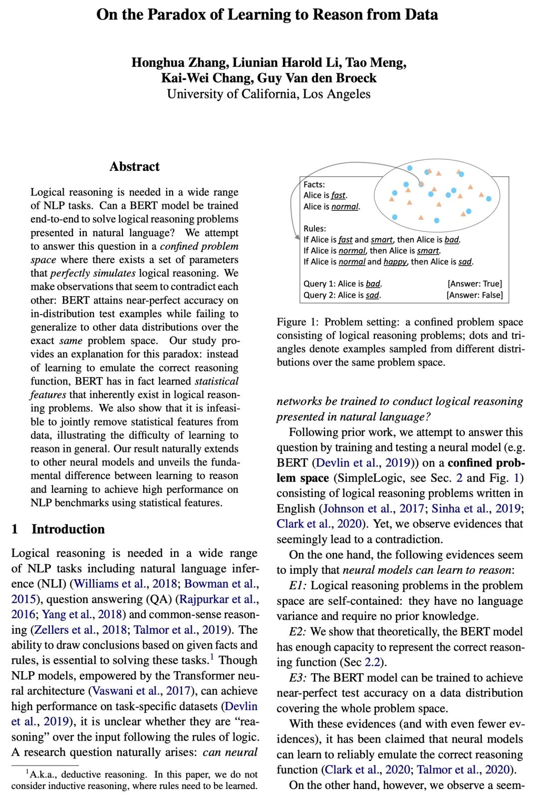 关于从数据中学习推理的悖论。在广泛的NLP任务中都需要逻辑推理。BERT模型能否被训练成端到端来解决自然语言中的逻辑推理问题?本文试图在一个有限的问题空间中回答该问题,在这个问题空间中存在着一组完美模拟逻辑推理的参数。观察结果似乎是相互矛盾的。BERT在分布内的测试样本上达到了近乎完美的准确性,而在完全相同的问题空间上却无法泛化到其他数据分布。本文研究为这一悖论提供了解释:BERT不是学习模仿正确的推理函数,而是事实上学习了逻辑推理问题中固有的统计特征。本文还表明,从数据中联合去除统计特征是不可行的,说明了推理学习的困难之处。本文结果自然延伸到其他神经模型,并揭示了学习推理和学习使用统计特征在NLP基准上取得高性能之间的根本区别。