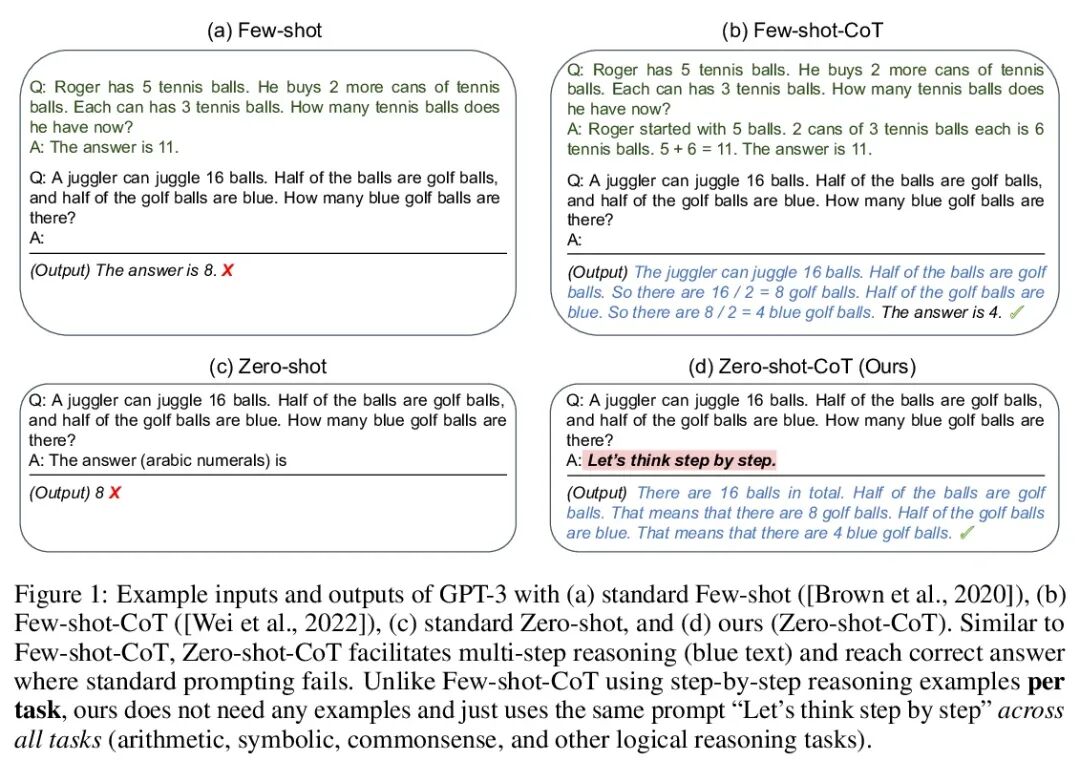 Pretrained large language models (LLMs) are widely used in many sub-fields of natural language processing (NLP) and generally known as excellent few-shot learners with task-specific exemplars. Notably, chain of thought (CoT) prompting, a recent technique for eliciting complex multi-step reasoning through step-bystep answer examples, achieved the state-of-the-art performances in arithmetics and symbolic reasoning, difficult system-2 tasks that do not follow the standard scaling laws for LLMs. While these successes are often attributed to LLMs’ ability for few-shot learning, we show that LLMs are decent zero-shot reasoners by simply adding “Let’s think step by step” before each answer. Experimental results demonstrate that our Zero-shot-CoT, using the same single prompt template, significantly outperforms zero-shot LLM performances on diverse benchmark reasoning tasks including arithmetics (MultiArith, GSM8K, AQUA-RAT, SVAMP), symbolic reasoning (Last Letter, Coin Flip), and other logical reasoning tasks (Date Understanding, Tracking Shuffled Objects), without any hand-crafted fewshot examples, e.g. increasing the accuracy on MultiArith from 17.7% to 78.7% and GSM8K from 10.4% to 40.7% with an off-the-shelf 175B parameter model. The versatility of this single prompt across very diverse reasoning tasks hints at untapped and understudied fundamental zero-shot capabilities of LLMs, suggesting high-level, multi-task broad cognitive capabilities may be extracted through simple prompting. We hope our work not only serves as the minimal strongest zeroshot baseline for the challenging reasoning benchmarks, but also highlights the importance of carefully exploring and analyzing the enormous zero-shot knowledge hidden inside LLMs before crafting finetuning datasets or few-shot exemplars.