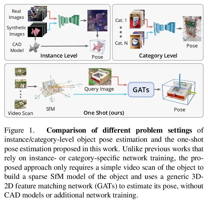 OnePose: 免CAD模型的单样本目标姿态估计。本文提出一种名为OnePose的目标姿态估计新方法。与现有的实例级或类别级方法不同,OnePose不依赖于CAD模型,可处理任意类别的目标,无需进行针对实例或类别的网络训练。OnePose借鉴了视觉定位的思路,只需要对目标进行简单的RGB视频扫描,就可以建立目标的稀疏SfM模型。然后,该模型被注册到具有通用特征匹配网络的新查询图像上。为了缓解现有视觉定位方法的缓慢运行时间,提出一种新的图注意网络,该网络直接将查询图像中的2D兴趣点与SfM模型中的3D点进行匹配,从而实现高效和鲁棒的姿态估计。与基于特征的姿态跟踪器相结合,OnePose能稳定地检测和实时跟踪日常家用物品的6D姿态。本文还收集了一个大规模数据集,其中包括150个目标的450个序列。