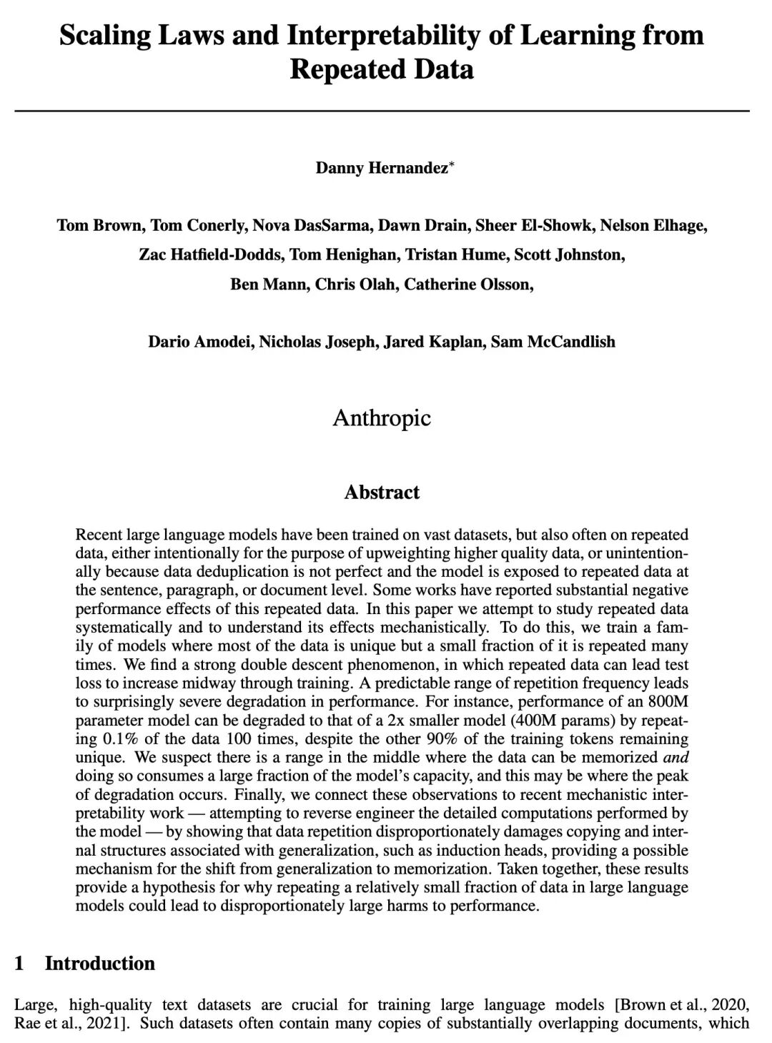 Recent large language models have been trained on vast datasets, but also often on repeated data, either intentionally for the purpose of upweighting higher quality data, or unintentionally because data deduplication is not perfect and the model is exposed to repeated data at the sentence, paragraph, or document level. Some works have reported substantial negative performance effects of this repeated data. In this paper we attempt to study repeated data systematically and to understand its effects mechanistically. To do this, we train a family of models where most of the data is unique but a small fraction of it is repeated many times. We find a strong double descent phenomenon, in which repeated data can lead test loss to increase midway through training. A predictable range of repetition frequency leads to surprisingly severe degradation in performance. For instance, performance of an 800M parameter model can be degraded to that of a 2x smaller model (400M params) by repeating 0.1% of the data 100 times, despite the other 90% of the training tokens remaining unique. We suspect there is a range in the middle where the data can be memorized and doing so consumes a large fraction of the model’s capacity, and this may be where the peak of degradation occurs. Finally, we connect these observations to recent mechanistic interpretability work — attempting to reverse engineer the detailed computations performed by the model — by showing that data repetition disproportionately damages copying and internal structures associated with generalization, such as induction heads, providing a possible mechanism for the shift from generalization to memorization. Taken together, these results provide a hypothesis for why repeating a relatively small fraction of data in large language models could lead to disproportionately large harms to performance.