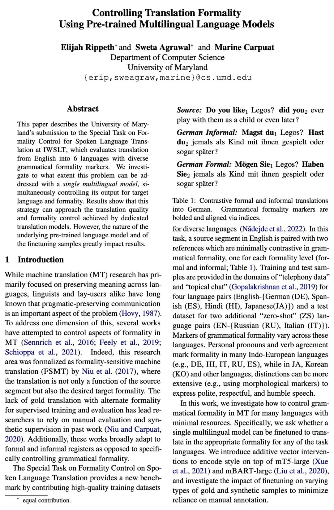[CL] Controlling Translation Formality Using Pre-trained Multilingual Language Models