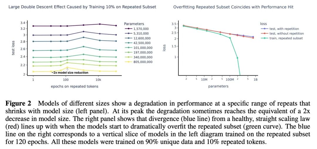 重复数据学习的扩展律和可解释性。最近的大型语言模型是在庞大的数据集上训练的,但也经常在重复数据上进行训练,有的是为了提高高质量数据的权重而有意为之,有的是因为数据去重不完善而无意中使模型暴露在句子、段落或文档层面的重复数据中。一些工作研究了这种重复数据对性能的实质性负面影响。本文试图系统地研究重复数据,并从机制上理解其影响。为做到这一点,训练了一个模型族,其中大部分数据是唯一的,但有一小部分数据是多次重复的。发现一个明显的双降现象,其中重复数据会导致测试损失在训练的中途增加。一个可预测的重复频率范围会导致令人惊讶的严重性能下降。例如,一个800M参数的模型的性能可以通过重复100次0.1%的数据而下降到一个一半小的模型(400M参数),尽管其他90%的训练token仍然是唯一的。怀疑这中间有一个范围,在该范围内,数据可以被记忆,而这样做会消耗模型的很大一部分容量,这可能是退化的峰值发生的地方。最后,将这些观察结果与最近的机制可解释性工作——试图对模型进行的详细计算进行逆向工程——联系起来,表明数据重复不成比例地损害了与泛化有关的复制和内部结构,如归纳头,为从泛化到记忆的转变提供了一种可能的机制。综上所述,这些结果提供了一个假设,说明为什么在大型语言模型中重复相对较小的一部分数据会导致对性能不成比例的巨大损害。