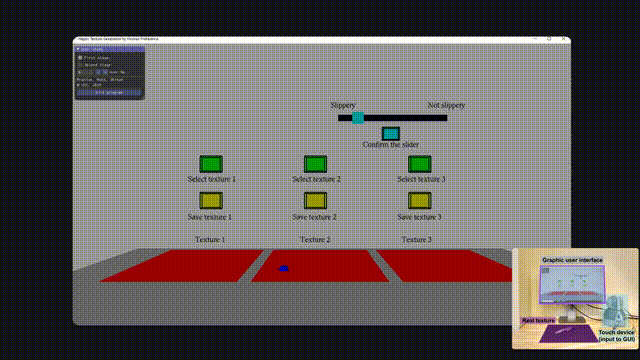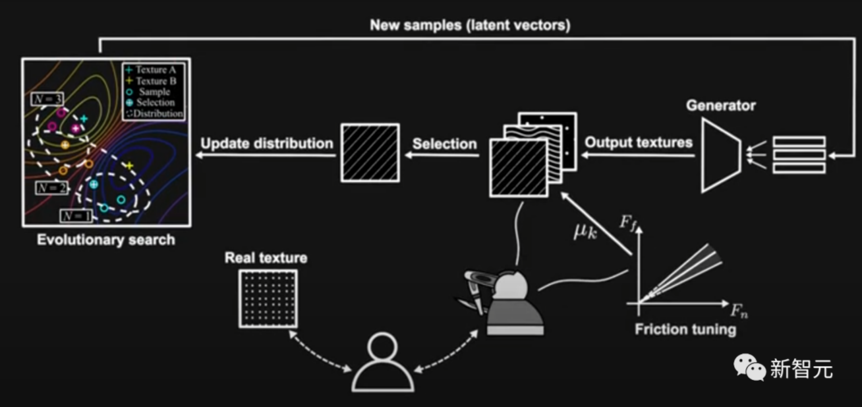 偏好驱动的模型首先会给用户一个真实的触摸纹理,然后模型会使用几十个变量随机生成三个虚拟纹理,然后用户可以从中选择摸起来与真实物体最相似的一个纹理。