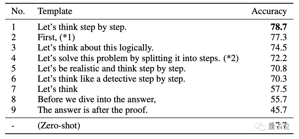 这篇论文中总结了9个最有效的提示词,其中换着花样让GPT-3逐步思考的前6个都让准确率暴涨到70%以上。