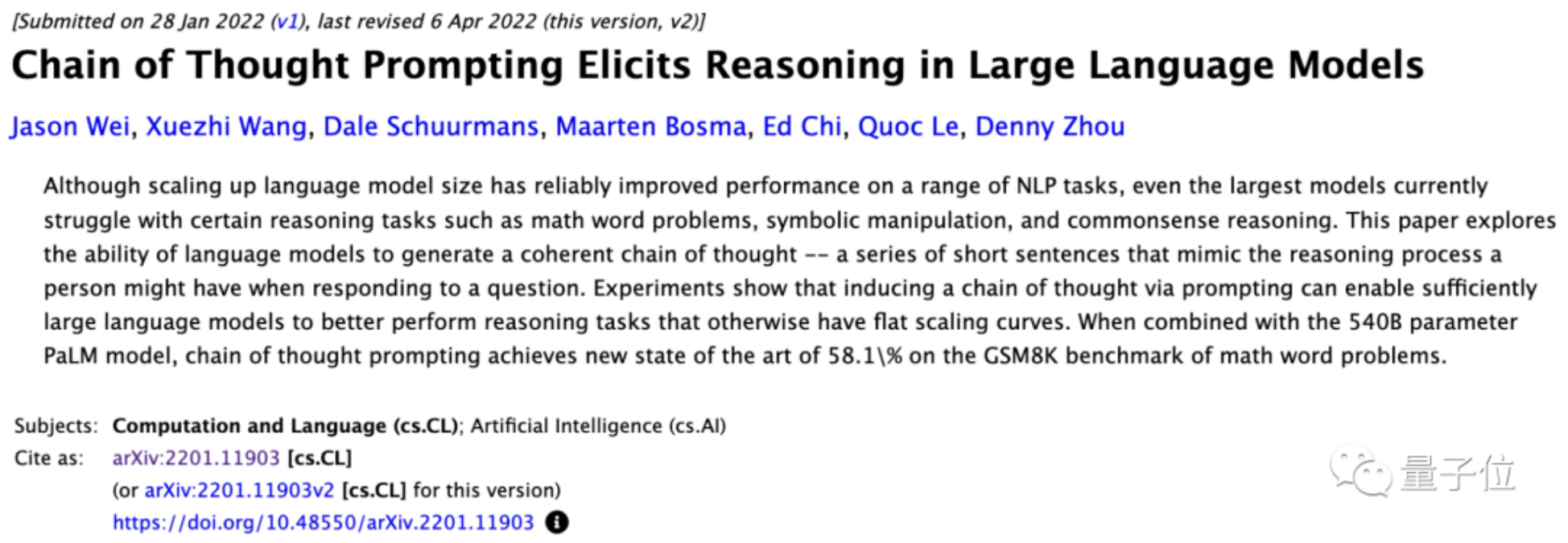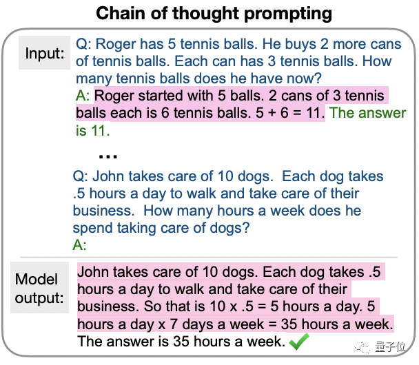 所用方法属于Chain of Thought Prompting (思维链路提示,以下简称CoT),今年一月刚由谷歌大脑团队提出。