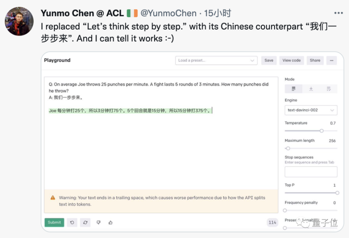 这个技巧似乎也不需要对GPT-3做魔改,已经有人在OpenAI官方Demo上成功复现,甚至换成中文也行。