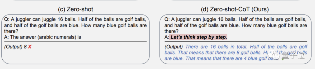 因为最新研究发现,只要对GPT-3说一句“让我们一步一步地思考”,就能让它正确回答出以前不会的问题。