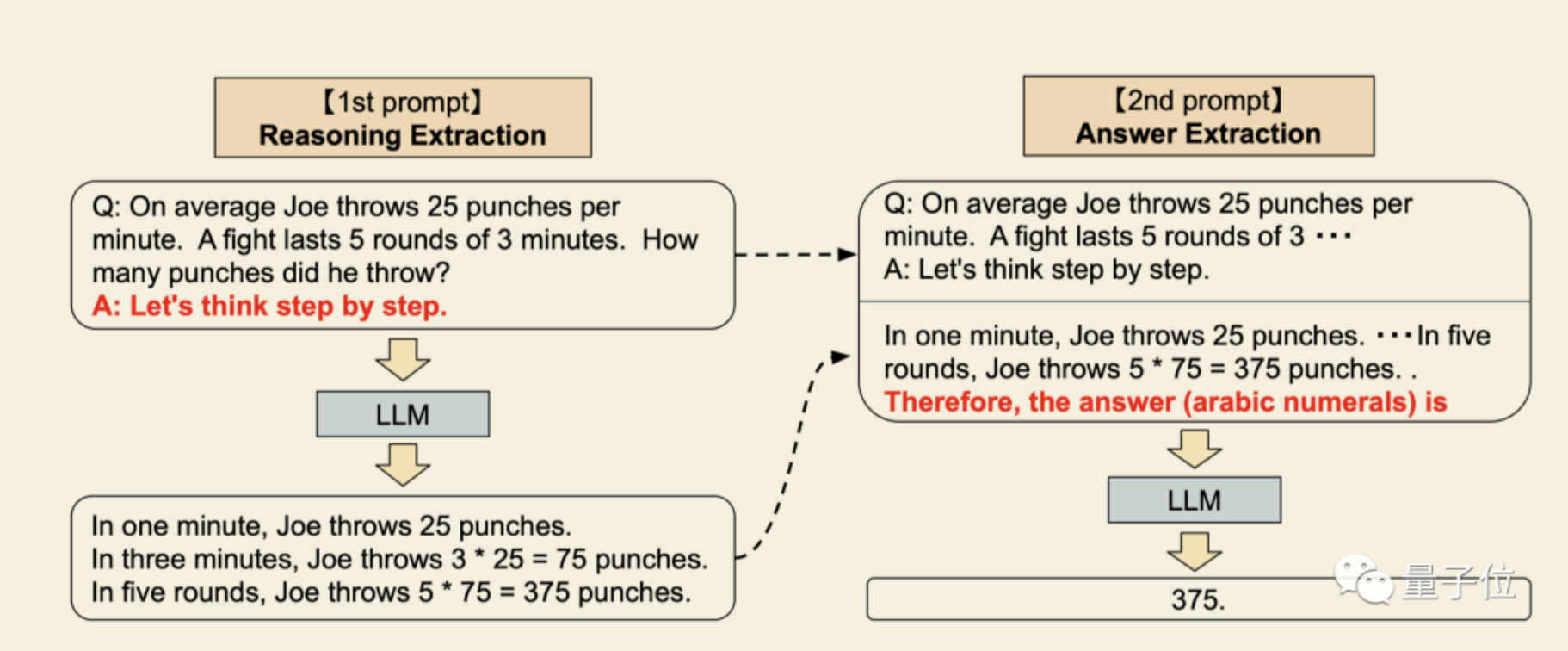 第二步属于额外实验,增加了“答案是……”的提示促使语言模型给出最终答案。