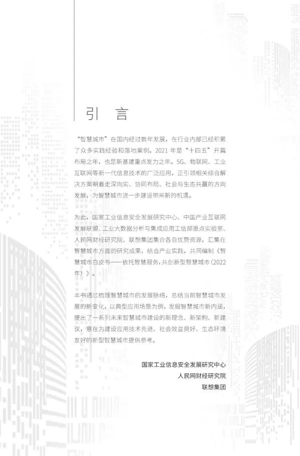 日前,由国家工业信息安全发展研究中心、中国产业互联网发展联盟、工业大数据分析与集成应用工信部重点实验室、人民网财经研究院、联想集团共同编制的《依托智慧服务共创新型智慧城市——2022智慧城市白皮书》(以下简称“白皮书”)正式发布。