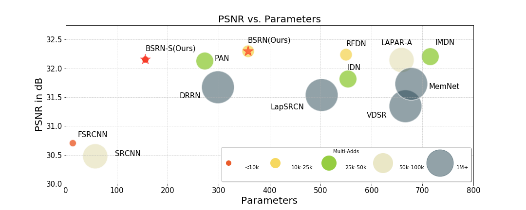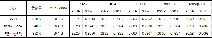 BSRN与SOTA方法对比如图1所示,横轴表示参数量,纵轴为性能,圆半径代表计算量。BSRN-S占据了左上角,参数量和计算量非常小,超分重建效果与其他方法相当。