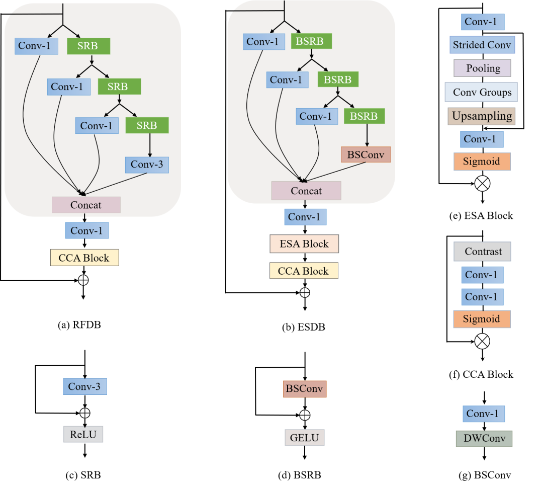 如图3所示,我们还引入了两个有效的注意力模块,增强空间注意力(ESA)和对比度感知通道注意力(CCA),以增强模型能力。所提出的BSRN在现有的面向效率的SR网络中实现了最先进的性能。我们采用我们方法BSRN-S的变体参加了NTIRE 2022 Efficient SR Challenge,并在模型复杂度赛道获得冠军。