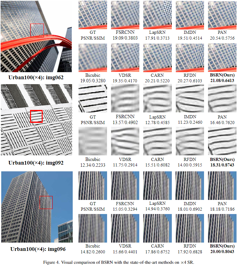视觉效果对比:如图4所示,BSRN效果相比于其他方法在局部效果中有着出色的视觉表现,图中的PSNR和SSIM均在图中的局部切片计算。在其他方法对图中的线条纹理恢复不佳的地方,BSRN获得了相当优秀的恢复效果,线条清晰准确,伪影和扭曲最少。