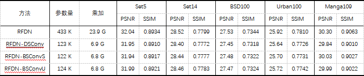 如表1所示,本节进行了对比实验以展示基于 RFDN 的不同卷积分解方式的效果,其中DSConv表示深度可分离卷积,BSConvS和BSConvU表示BSConv两个变体。可以观察到虽然直接使用卷积分解的方法使得模型的性能产生了一定程度的负面影响,但是可以观察到模型的参数量和计算量(本章使用乘加作为计算量的量化指标)大幅度下降。而在表中的卷积分解方法中,BSConvU表现最佳,故最终在模型中使用了BSConvU。