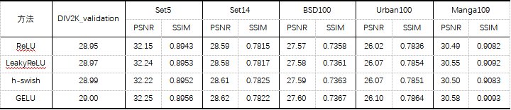 之前的SR网络大多采用 ReLU或 LeakyReLU作为激活函数。然而,GELU逐渐成为近期作品中的主流选择。MobileNet V3研究了高效模型中不同激活函数的影响,并提出了一种新的激活函数 h-swish。因此,本节还研究了各种激活函数,以探索本章方法的最佳选择。