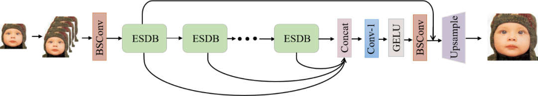我们对AIM2020的冠军方法RFDN做了三个主要改进,构建了ESDB。如图3所示,一是引入了BSConv代替了SRB和ESA 模块中的标准卷积,消融实验证明,在网络结构不变的情况下在轻微损失性能,大幅度降低了网络的参数量和计算量。二是使用GELU激活函数代替了ReLU激活函数。三是综合利用了两种不同的注意力模块,从空间和通道两个方面使用注意力机制,在少量增加参数量的情况下,提升了网络性能。