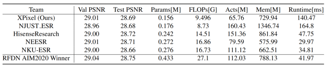 Sub-Track 1: Model Complexity Track冠军:经过优化后的模型在RTX 3090,CUDA 11.1,Pytorch 1.9.1的系统环境下进行测试得到如表3的结果,可以观察到优化后的模型运行时间可以缩短为原先的73.4%,运行时间接近RFDN。
