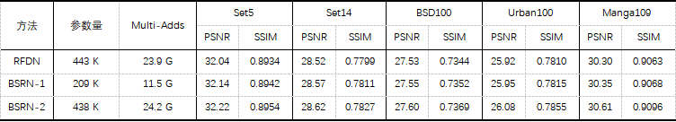 如表4所示,可以观察到BSRN-1在参数量和计算量仅仅为RFDN一般的情况下优于RFDN的超分效果。此外,参数量和计算量接近RFDN的情况下,BSRN-2获得了显着的性能提升,尤其是在Manga109数据集上。