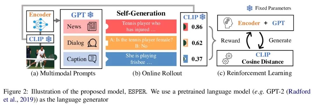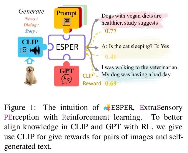 强化学习多模态知识对齐。大型语言模型很容易自适应新环境,甚至没有特定任务的训练数据。其零样本能力是否可以扩展到多模态输入?本文提出ESPER(ExtraSensory PErception with Reinforcement learning),将仅有语言的零样本模型扩展到未见过的多模态任务,如图像和音频描述。本文的关键创新在于,利用强化学习将多模态输入与语言模型生成相一致,无需直接监督:例如,对于图像案例,奖励优化仅依赖于从CLIP得出的余弦相似度,因此不需要额外的明确配对(图像、描述)数据。由于语言模型的参数没有变化,该模型保持了其零样本泛化的能力。实验表明,ESPER在各种零样本任务上的表现优于基线和之前的工作;其中包括本文收集和发布的新基准——ESP数据集,其任务是让模型为每张图片生成几个不同风格的描述。