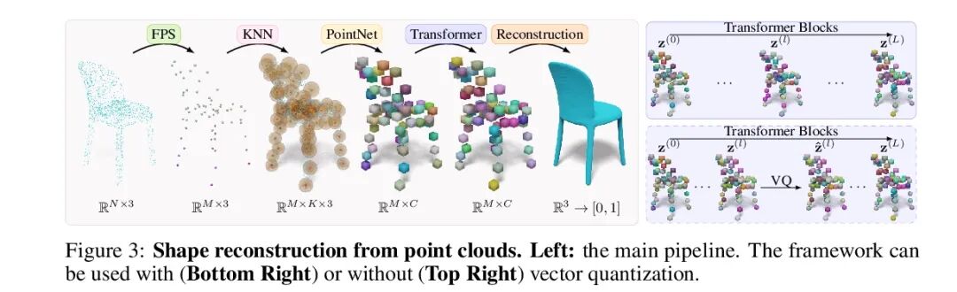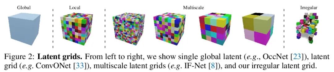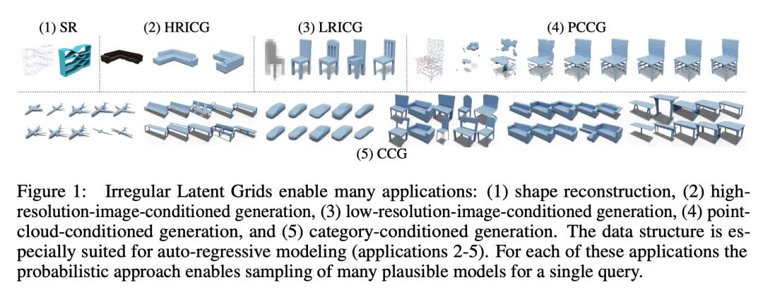 3DILG:3D生成建模的不规则潜网格。本文提出一种新的表示方法,将3D形状编码为神经场。该表示法被设计为与Transformer结构兼容,并有利于形状重建和形状生成。现有的关于神经场的工作是基于网格的表示,潜点定义在一个规则网格上。相比之下,本文在不规则网格上定义潜点,所得到的表示是稀疏的和自适应的。在从点云进行形状重建的背景下,建立在不规则网格上的形状表示在重建精度方面比基于网格的方法有所提高。在形状生成方面,所提出的表示方法促进了用自回归概率模型的高质量形状生成。展示了不同的应用,这些应用比目前的技术水平有所提高。展示了从单幅高分辨率图像中进行概率形状重建的结果;训练了一个以极低分辨率图像为条件的概率模型;将模型应用于类别条件下的生成。所有的概率实验证实,所提出表示能生成详细和高质量的形状,达到了生成式3D形状建模的新技术水平。