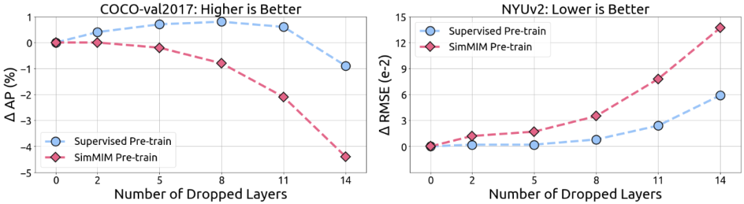 直观理解,注意力头多样性的损失一般会影响模型的表达能力。为了验证这一点,文中尝试了在微调过程中丢掉有监督模型的最后几层,并发现在丢掉合适层数的情况下,下游任务的微调性能不下降(右图)或甚至会上升(左图),然而在 MIM 模型中并没有观察到这一现象。这也进一步验证了注意力头多样性的损失会一定程度上损害下游任务的性能。