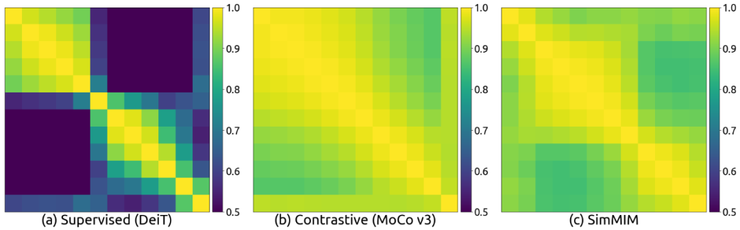 不同层特征之间的表示差异:上图使用 Centered Kernel Analysis (CKA) 展示了模型在不同层之间学到特征的相似程度。在 MIM 模型中,不同层的特征表示具有非常高的相似性,它们的 CKA 值都非常大([0.9, 1.0])。但对于有监督模型,不同的层学到的特征差异较大。