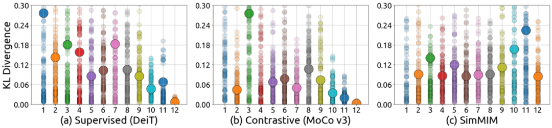 注意力头的多样性:上图展示了不同模型在每一层中的不同注意力头(Attention Head)关注的像素是否相同。在 MIM 模型中,对所有层,不同的注意力头均倾向于关注不同的像素,即 KL 散度较大。但是对于有监督模型来说,注意力头的多样性随着层数变深而减少,最后三层的多样性已经非常小了。对比学习模型和有监督模型的表现依然极其相似。