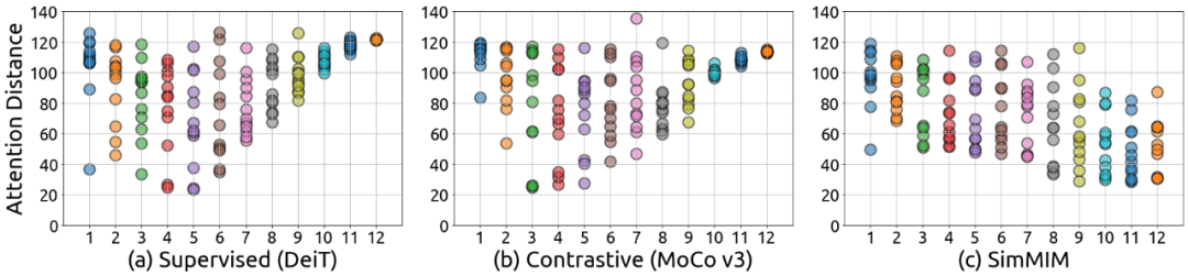 局部性 v.s. 全局性:首先,上图展示了有监督模型和 MIM 模型在不同层的平均注意力距离,发现 MIM 给训练后的模型带来了局部性的归纳偏置,即在所有层均在某些注意力头中倾向于关注附近的像素。但有监督的模型倾向于在较低层中关注局部像素,而在较深层中关注全局像素。对比学习模型和有监督模型的表现极其相似。