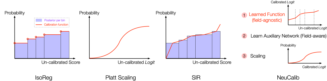 业界常用的校准方法大致上可分为三类:(1)Binning-based 方法:以保序回归 (Isotonic Regression, IsoReg) [1] 为代表,将样本按模型预估值升序排列后分桶并计算桶内的后验概率(若连续的两个桶的后验概率不满足升序则进行合并桶,直到各桶的后验值满足升序),将桶内后验值作为桶内全部样本的校准后预估值。此类方法的优势在于校准不会影响预估模型对样本的排序,但通常是非参的、表达能力受限,并且不能给出样本粒度的校准值。(2)Scaling-based 方法:以 Platt Scaling [2]、Gamma Calibration [3] 等为代表,通常是学习参数化的函数将 logit 进行映射来完成校准(该类方法被用于对 SVM 等输出无明显概率意义的模型进行校准,因此不是直接对预估值做校准),通过假设概率服从某类特定分布,来给出校准函数中待学习的参数,不同的参数化形式对应于对分布的不同假设。这类方法的表达能力强,但各种分布假设都可能有其适用性的问题。(3)Hybrid 方法:以 Smoothed IsoReg (SIR) [4] 和 Neural Calibration (NeuCalib) [5] 为代表,该类方法结合了 binning 和 scaling 两类方法的优势。SIR 在 IsoReg 基础上通过线性插值 scaling 来得到每个样本的校准后预估值,因此校准函数为分段线性的形式。NeuCalib 提出了特征粒度校准 (field-aware calibration) 的概念,即认为给定特征域 (field) 下的不同特征取值 (field value) 应该有不同的校准函数,因为不加区分地用全局后验作为校准依据时会出现一些样本被抬高而另一些样本被拉低的情况。方法层面上,NeuCalib 采用将 logit 分桶后学习一个全局的分段线性函数作为校准函数,并在映射后的 logit 上添加了一路辅助网络来补充特征信息,最终经过 scaling 来给出校准值。以上方法仅有 NeuCalib 涉足了特征粒度校准,然而其校准函数的学习过程依然与特征无关。