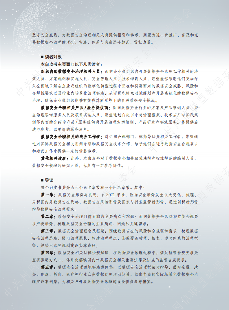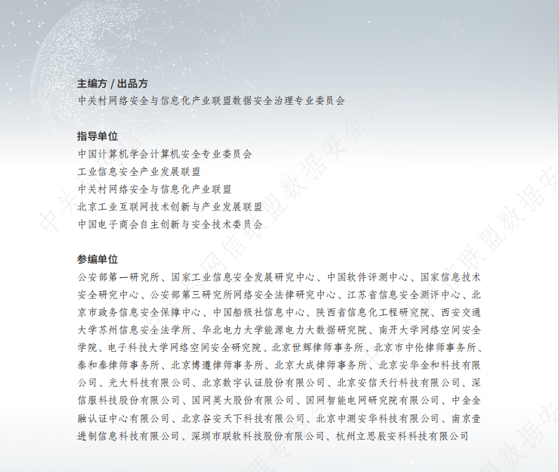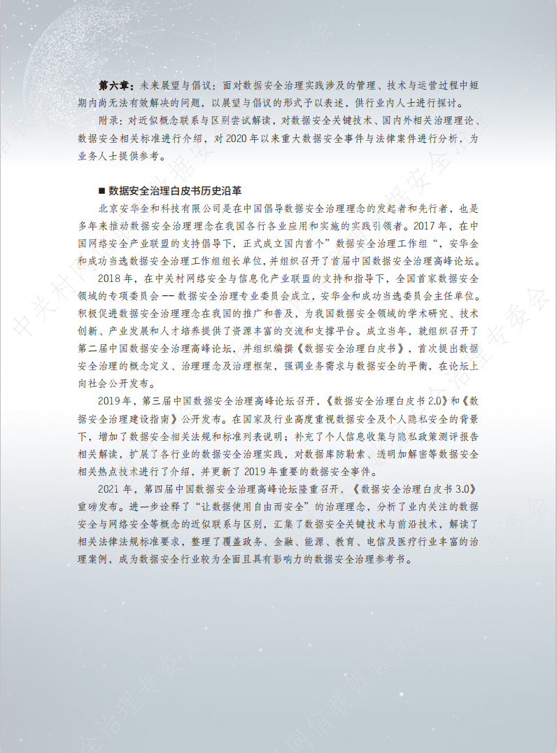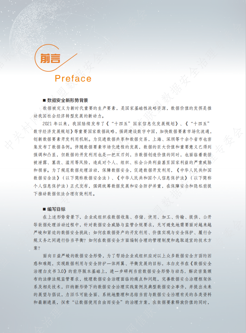 近日,由中关村网络安全与信息化产业联盟数据安全治理专业委员会主编,中国计算机学会计算机安全专业委员会、工业信息安全产业发展联盟、中关村网络安全与信息化产业联盟、北京工业互联网技术创新与产业发展联盟、中国电子商会自主创新与安全技术委员会指导,31家极具影响力的产学研机构共同参编的《数据安全治理白皮书4.0》发布。数据被定义为新时代重要的生产要素,是国家基础性战略资源,数据价值的发挥是推动我国社会经济转型发展的新动力。2021 年以来,我国陆续发布了《“十四五”国家信息化发展规划》、《“十四五”数字经济发展规划》等重要国家数据战略,强调建设数字中国,加快数据要素市场化流通,创新数据要素开发利用机制。为促进数据共享和数据交易,上海、深圳等十余个省市也密集发布了数据条例。伴随数据要素市场化进程的发展,数据的巨大价值和重要意义已得到强调和凸显,但数据的开发利用也是一把双刃剑,当数据创造价值的同时,也面临着数据被泄露、篡改、滥用等风险,造成对人个人、组织、社会公共利益甚至国家利益的严重威胁和损害。为了规范数据处理活动,保障数据安全,促进数据开发利用,《中华人民共和国数据安全法》 (以下简称数据安全法 ) 、《中华人民共和国个人信息保护法》 (以下简称个人信息保护法 ) 正式发布,强调统筹数据发展和安全防护并重,在保障安全和隐私前提下推动数据依法合理有效利用。在上述形势背景下,企业或组织在数据收集、存储、使用、加工、传输、提供、公开等数据处理活动过程中,针对数据安全威胁与监管合规要求,无可避免地需要面对越来越严峻和紧迫的数据安全挑战: 如何在数据资产的开发利用、价值实现与安全保护、履行合规义务之间进行恰当平衡? 如何在数据安全方面编制合理的管理制度和选取适宜的技术方案?面向日益严峻的数据安全形势,为了帮助企业或组织应对以上众多数据安全方面的困惑和难题,实现数据利用与安全防护一体两翼、平衡发展的目标,本白皮书在《数据安全治理白皮书 3.0》的前序版本基础上,选一步研判当前数据安全形势与动态,解读密集颁布的法律法规监管要求,梳理数据安全治理面临的痛点和问题,完善数据安全治理框架体系及相关技术,归纳新形势下的数据安全治理实践案例及典型数据安全事件,并提出未来的展望与倡议,力图尽可能全面、系统地整理和总结当前与数据安全治理有关的各类资料和最新进展,探索“让数据使用自由而安全”的治理方案,在数据要素释放价值的同时坚守安全底线。为数据安全治理相关人员提供指引和参考,期望为进一步推广、普及和完善数据安全治理的理论、方法、体系与实践添砖加瓦、贡献力量。白皮书总计219页,探讨了数据安全的形势和挑战,面临的痛点和难题,数据安全治理的框架,法律法规的解读,以及最新的案例,是学习数据安全的好材料。