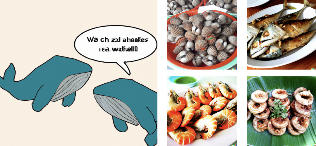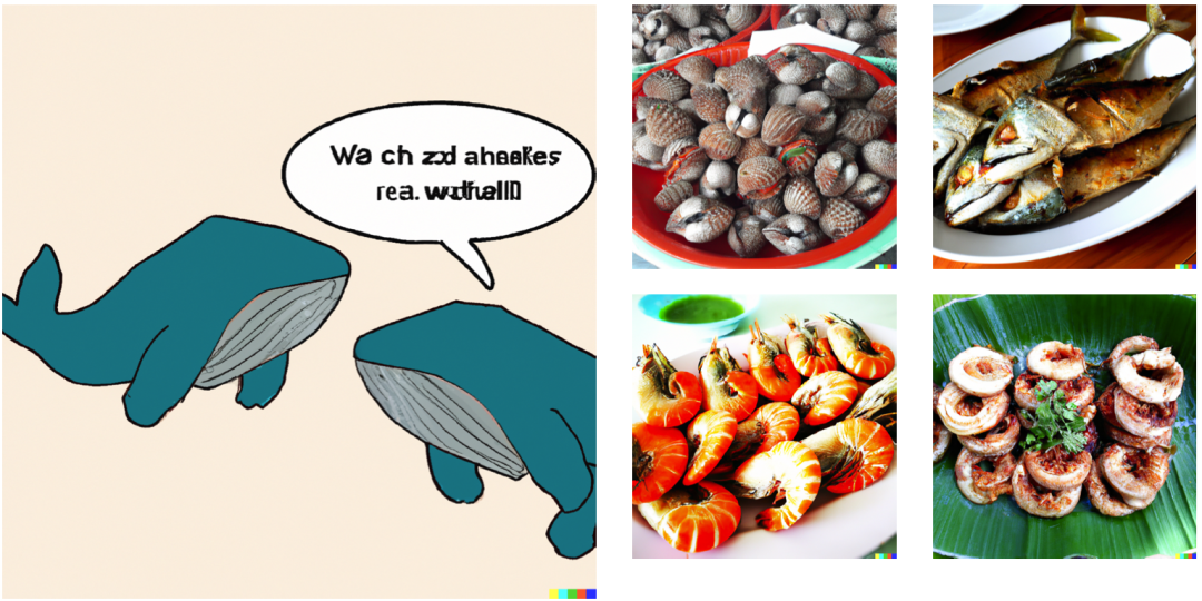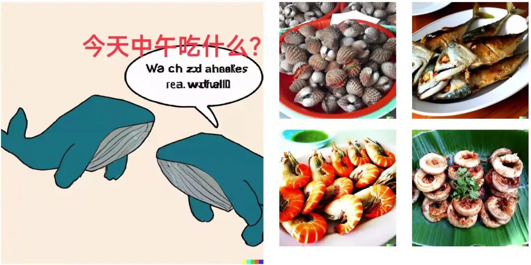 谁看的懂??可能人类不懂就对了——我猜这两头鲸鱼正在用DALLE-2 的语言谈论它们的食物。紧接着,把这句话作为输入,DALL·E-2生成的图像(右)是......一堆海鲜美食!