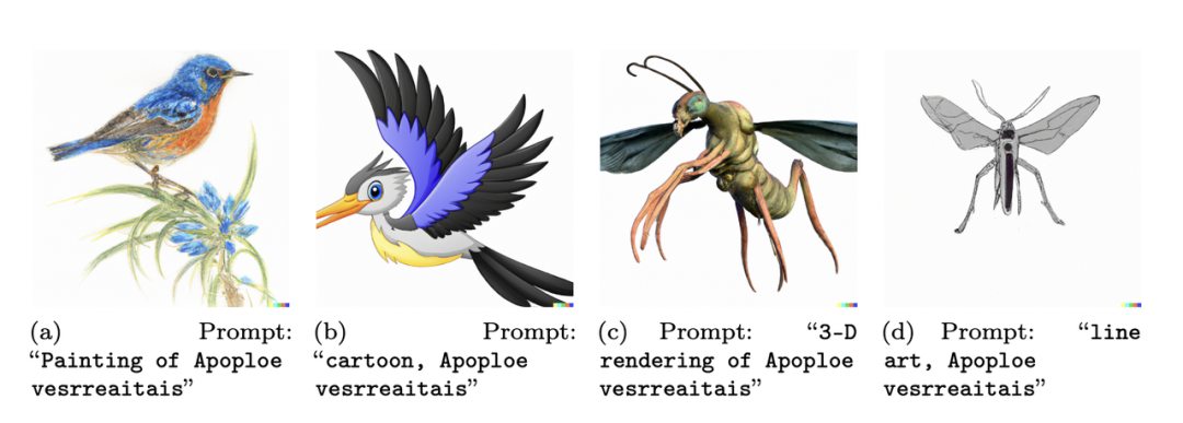 DALL·E-2 生成的不同风格的 “Apoploe vesrreaitais”,形态虽异,但“会飞的东西 ”这一视觉概念得到了保持。