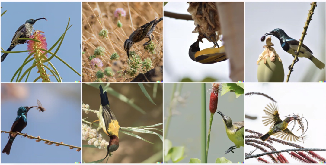 DALL·E-2生成了下面这些图像,图像内容翻译成英语,显然是“A bird is eating a bug”(一只鸟在吃虫子)