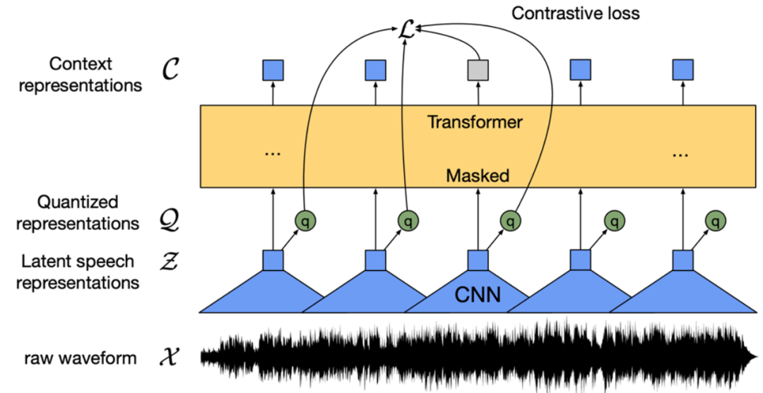 图 1: Wav2vec 2.0 模型结构 (Baevski et al., 2020)